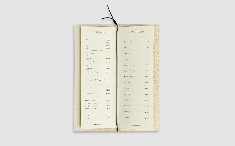 こちらの事例で使用している表紙素材は、和紙の壁紙となります。壁紙素材は種類が豊富なので、店舗様のイメージに合うものをご用意できます。(今ジワジワきている素材です…..!)種類が豊富なだけではなく、壁紙なので撥水処理や防菌・防カビ処理などを施しているものもあるので、飲食店のメニューブックにはオススメの素材となっております。また、合皮や紙・布では表現しにくい表面の凹凸も壁紙では表現可能なので、色々なアレンジが可能な素材となっております。(木のようなデザイン・石のようなデザインなどもございます)