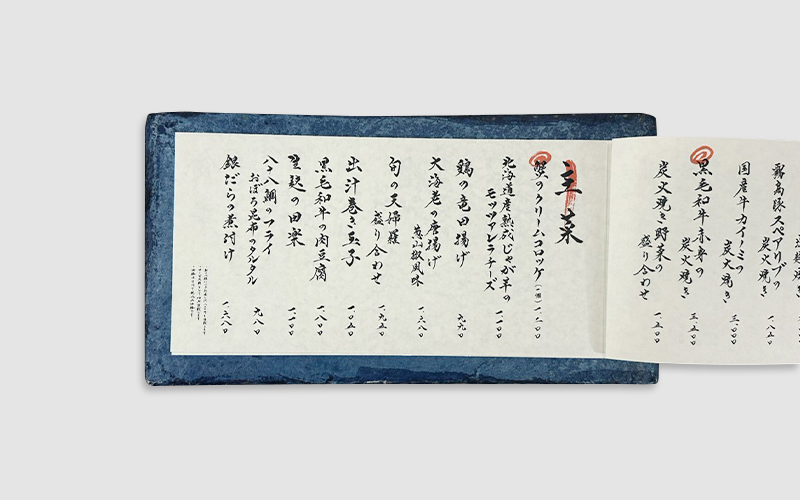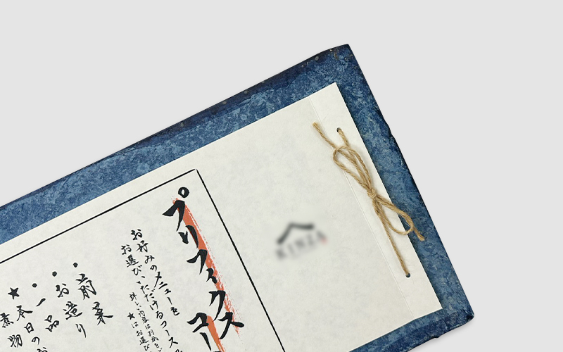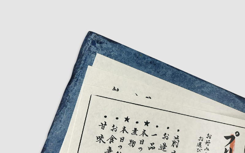 ボードタイプだからといって「1ページしか使えない」と思い込んでいませんか?ボードに穴を開け、紐で綴じることで、ページ物にも対応できます。ボード部分が和紙なので、本文もあわせて和紙調のものを使用しています。和紙は薄く裏面に透けてしまう特性がございますので、表面だけに印刷して2つ折りすることで、めくりやすく且つ和紙の素材感を活かしたメニューボードに仕上がっています。
