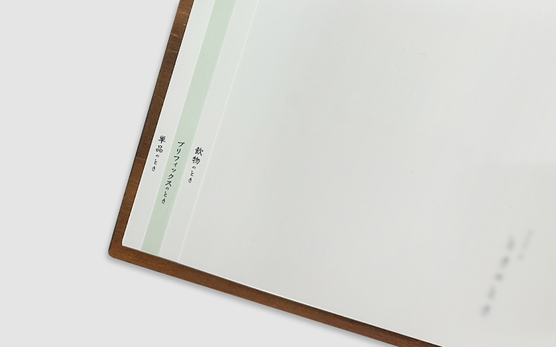 お客様にも嬉しい!インデックスタイプのメニューボードになります。インデックスタイプだと、紙のサイズがページ毎に異なるため、店舗様での印刷が難しく断念するケースが多々ございます。ですが、インデックスタイプは、実際にメニューを見るお客様にはとても嬉しい機能なのでは?と…..そんなお客様の為を思った機能性メニューになります。印刷~セットまで一括でも承っておりますので、お気軽にご相談ください。