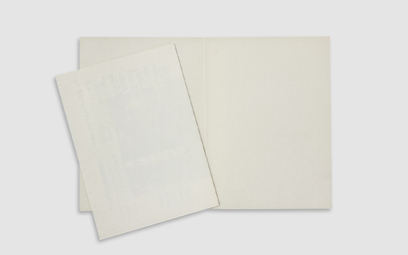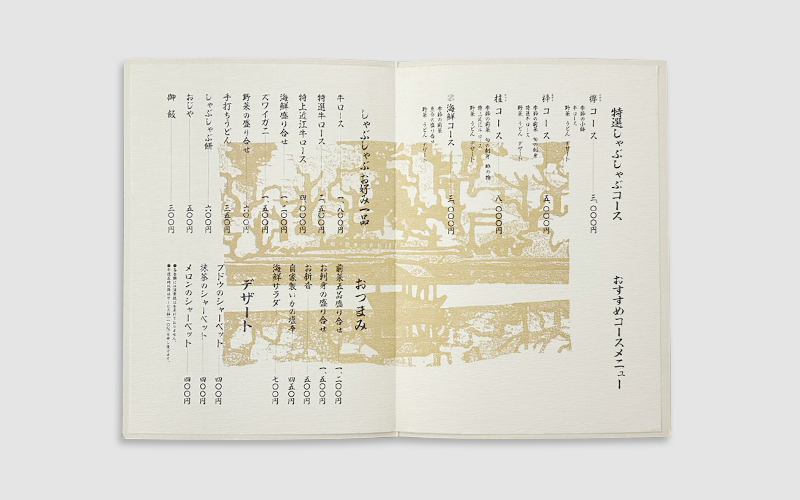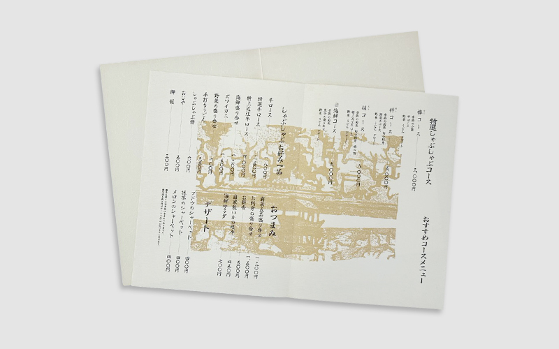 表紙と内側で違う色の紙を貼り合わせて、表紙に店舗名を大きく印刷した、目を惹く仕上がりのメニューになります。こちらはオリジナルで制作したメニューですが、難しい加工をしていないので比較的安価に制作ができます。紙のみなので、汚れたり壊れたりしてもすぐにお取替えが可能です。