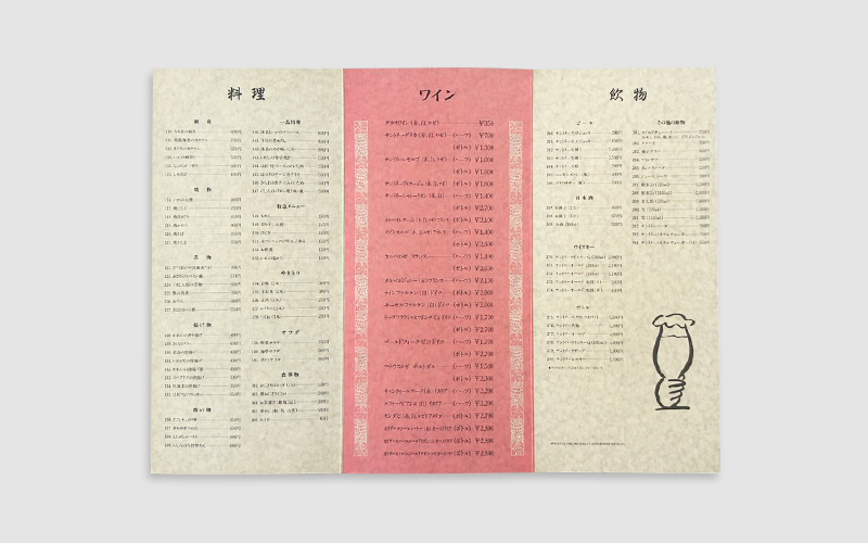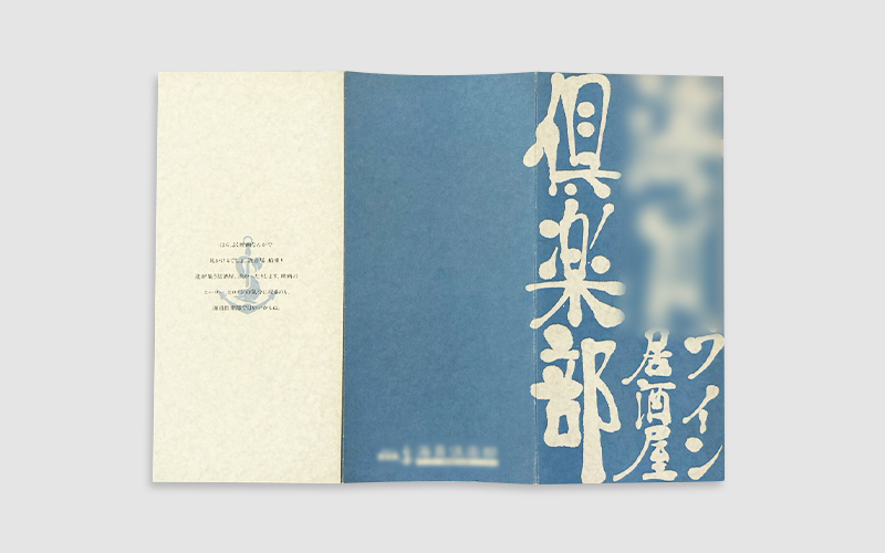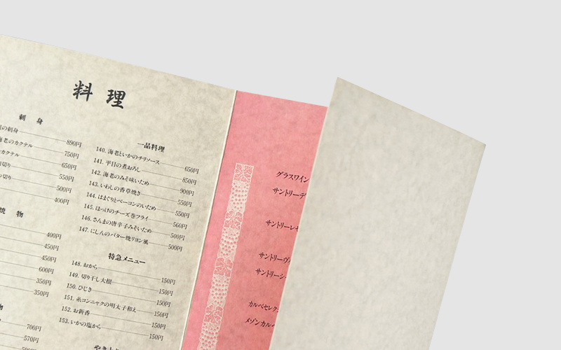 こちらの仕様は、表裏どちらも印刷(グラフィック)で表現したメニューになります。インパクトのある表紙のグラフィックは、版の大きさで料金が変動する箔押しなどの加工とは違い、1色ずつで料金が変動する印刷にて表現しております。印刷にすることによって、版の大きさを気にせずデザインできますので、オリジナリティあるメニューに仕上がります。